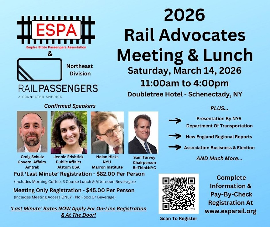 The Empire State Passengers Association (& Rail Passengers Association - Northeast Division) 2026 Annual Passenger Rail Advocates Meeting & Lunch will be held in person on Saturday, March 14, 2026, from 11:00am to 4:00pm, at the DoubleTree Hotel, 100 Nott Terrace, in downtown Schenectady, NY (approximately 5 blocks from the Amtrak Station).